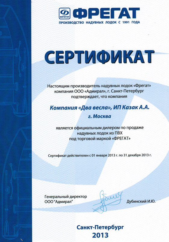 Сертификат подтверждает, что «Два весла» является официальным дилером продукции «Фрегат» и лидером по продаже лодок данной фирмы.